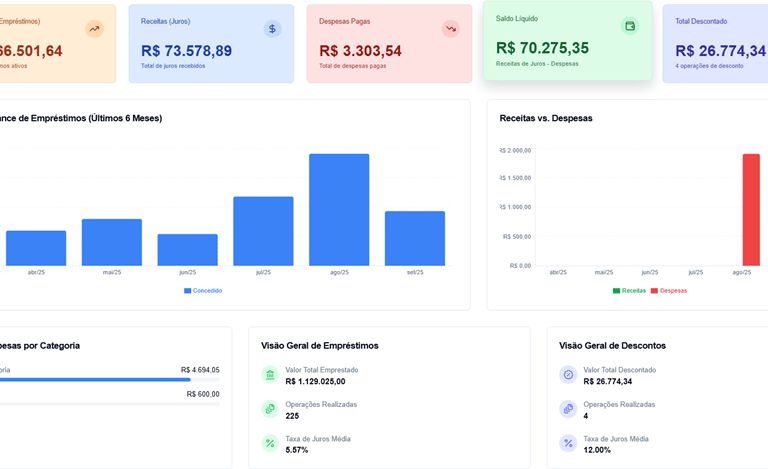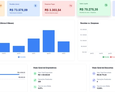 Controle cada detalhe dos seus empréstimos com praticidade. O sistema calcula automaticamente juros, IOF e parcelas, acompanha pagamentos em tempo real e gera relatórios completos para decisões mais seguras.